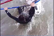 Waterstarting is faster and less tiring compared to climbing back on the board and uphauling the sail, but requires enough wind (about 14 knots or more, depending on the skills, weight and agility of the surfer) to perform.[2] Waterstarting requires flying the sail and getting the mast high enough so that the wind will finish in lifting the sailor's weight up and onto the board.[3]