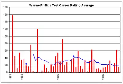 Phillips was one of the few Australian players to return home with his reputation enhanced during the 1985 Ashes tour, which Australia lost 3–1. An innings of 91 in the first Test came close to saving the game for Australia,[43] and in the second he made 21 in the first innings and came to the wicket in the second when Australia were 5/65 chasing 127 runs to win. He scored 29 in a partnership of 51 runs with Allan Border, taking Australia in sight of victory.[44]