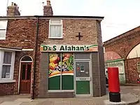 D&S Alahan's Corner Shop is situated at 15 Coronation Street and is on the junction to Viaduct Street. It was owned by Dev Alahan (Jimmi Harkishin) and Sunita Alahan (Shobna Gulati), until the death of Sunita in The Rovers Return fire in 2013; now it is solely owned by Dev. D&S Alahan's was hit by a tram in December 2010, while Sunita, Molly Dobbs (Vicky Binns) and her baby Jack were inside. Jack and Sunita were subsequently saved but Molly died. The shop was closed for the beginning of 2011 but re-opened in late February. Until December 2010, the corner shop was the only business that had stood since the very first episode. Another notable storyline for D&S Alahan's involved Maya Sharma (Sasha Behar) setting fire to the shop in 2004, leading to an explosion whilst Dev and Sunita were in the flat above.