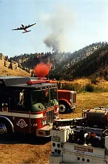 A wildfire suppression operation in Washington, United States in 2002. Methods here include fire retardant drops and the bulldozing of firebreaks.