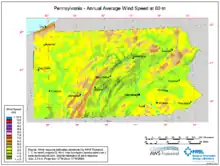 Wind Power in Pennsylvania, one of the major source of renewable energy, it accounts for over one third of the renewable energy production of Pennsylvania.[1] There are more than 27 wind farms currently installed in the commonwealth of Pennsylvania. These 27 farms on average could provide power for nearly 350,000 homes or 1,300 megawatts.[2] A majority of these wind farms are located in the southwest-central and northeastern regions of the state.[3] Pennsylvania is an East Coast leader in wind energy due to its natural wind resources and governmental incentives brought on by the state. There is a lot of potential for growth within the wind power industry in Pennsylvania and the Northeast. Pennsylvania is close to several offshore sites along the coast of the Atlantic Ocean.