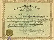 Charter of affiliation of the Wireless Association with the ARRL (1920).