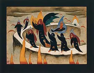 The artistic canons that Gradowczyk refers to were propagated by the official Argentine art institutions, which favored visual representations associated with national icons.[1] Painters like Carlos P. Ripamonte, Cesáreo Bernaldo de Quirós, and Fernando Fader extolled images of pampas landscapes and rural gaucho culture.[6] The arrival of Spanish intellectuals such as José Ortega y Gasset and Eugenio d'Ors created a new discourse around art that was disseminated among writers and artists working toward an aesthetic modernity.[6] Entierros firmly places Xul Solar as a member of this modernist Argentine movement. Rather than painting subjects recognizable as Argentine, Xul's focus is internal, painting from his own imagination. His early artistic output seems to represent the profusion of ideas and themes that grew out of Xul's contemplations. The flat shapes and bold colors used in the painting demonstrate a Cubist influence. The faces of the figures, particularly the eyes and shapes of heads can be seen as owing to the fashion for art and artifacts from Africa and the Americas mentioned above.