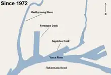 In 1957, the Upper Yarra Reservoir was constructed, primarily to alleviate flooding downstream. This reduced the river's flow to around 50%, where it sits today. Swanson Dock was constructed between 1966 and 1972 equipped for modern container shipping. Shipping activity at Victoria Dock during this time had gone into steep decline and it was almost disused by the mid-1970s. In February 1972, the CBD was flooded as the natural watercourse of Elizabeth Street became a raging torrent.[22] This was due mostly to previous storm water drainage works which utilised Elizabeth street as a watercourse during times of intense rain creating flash floods. Prior to settlements, the area now occupied by Elizabeth street was a gully off the river.