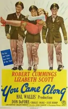 You Came Along (working title Don't Ever Grieve Me) is a 1945 romantic comedy-drama film set in World War II, directed by John Farrow. The original Robert Smith screenplay was rewritten by Ayn Rand. You Came Along stars Robert Cummings and in her film debut, Lizabeth Scott.[1]