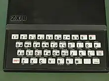 The front part of the case is occupied by an integrated 40-key membrane keyboard displaying 20 graphic and 54 inverse video characters.[4] Each key has up to five functions, accessed via the SHIFT and FUNCTION keys or depending on context. For example, the P key combines the letter P, the " character, and the BASIC commands PRINT and TAB. The ZX81 uses a standard QWERTY keyboard layout. The keyboard is mechanically very simple, consisting of 40 pressure-pad switches and 8 diodes under a plastic overlay, connected in a matrix of 8 rows and 5 columns.[8]