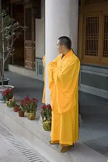 The Buddhist monk's zhiduo was worn as early as the Tang dynasty.[12] After the middle Tang dynasty, the zhiduo was worn together with the right bare cassock, called jiasha (Chinese: 袈裟; pinyin: jiasha).[12] The term jiasha was borrowed from the term Kasaya in China where it became a specific term to refer to a one-piece rectangular robe made out of patchwork.[13] The jiasha was typically black in colour in the Han dynasty; purple in the Tang dynasty and turned yellow since the Five dynasties period until now as the colour yellow in Buddhism represents the highest set of values: desire-less-ness, humility, and renunciation.[14] In certain geographical areas, the jiasha was also possible for the jiasha to be red or brown in colour.[14] In China, there were also regulations established by the Imperial court which regulated the colour of the jiasha based on ranks but which could vary depending on the different dynastic period.[14]