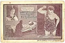![]() Post card written in Yiddish showing Breitbart in his last performance | |